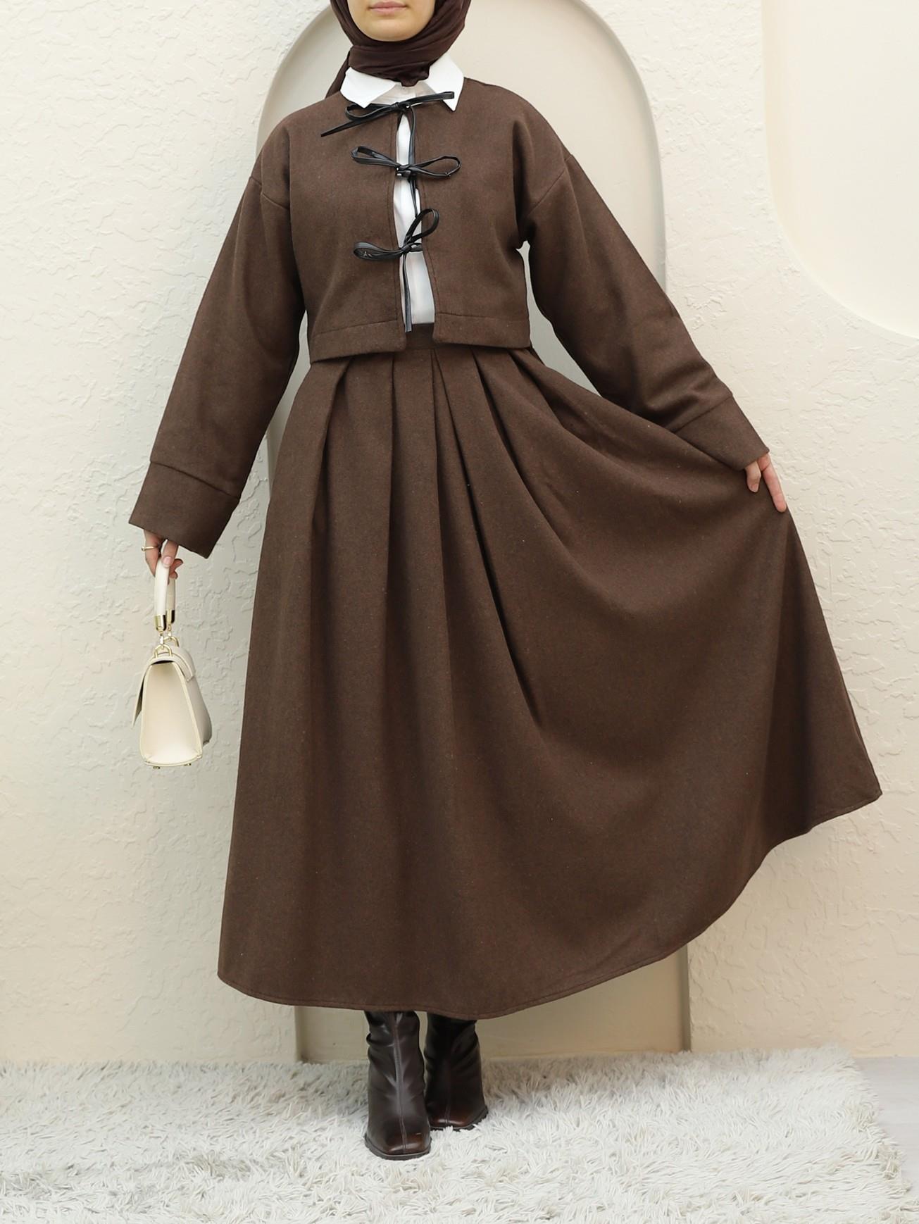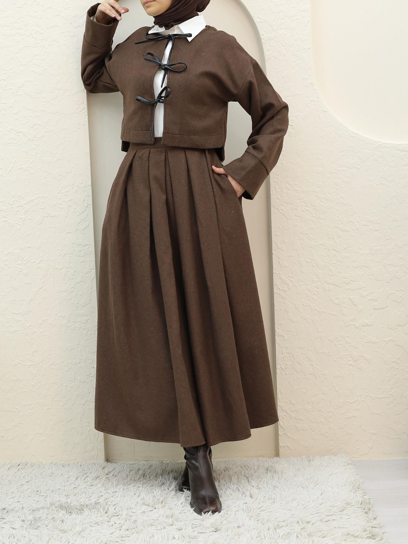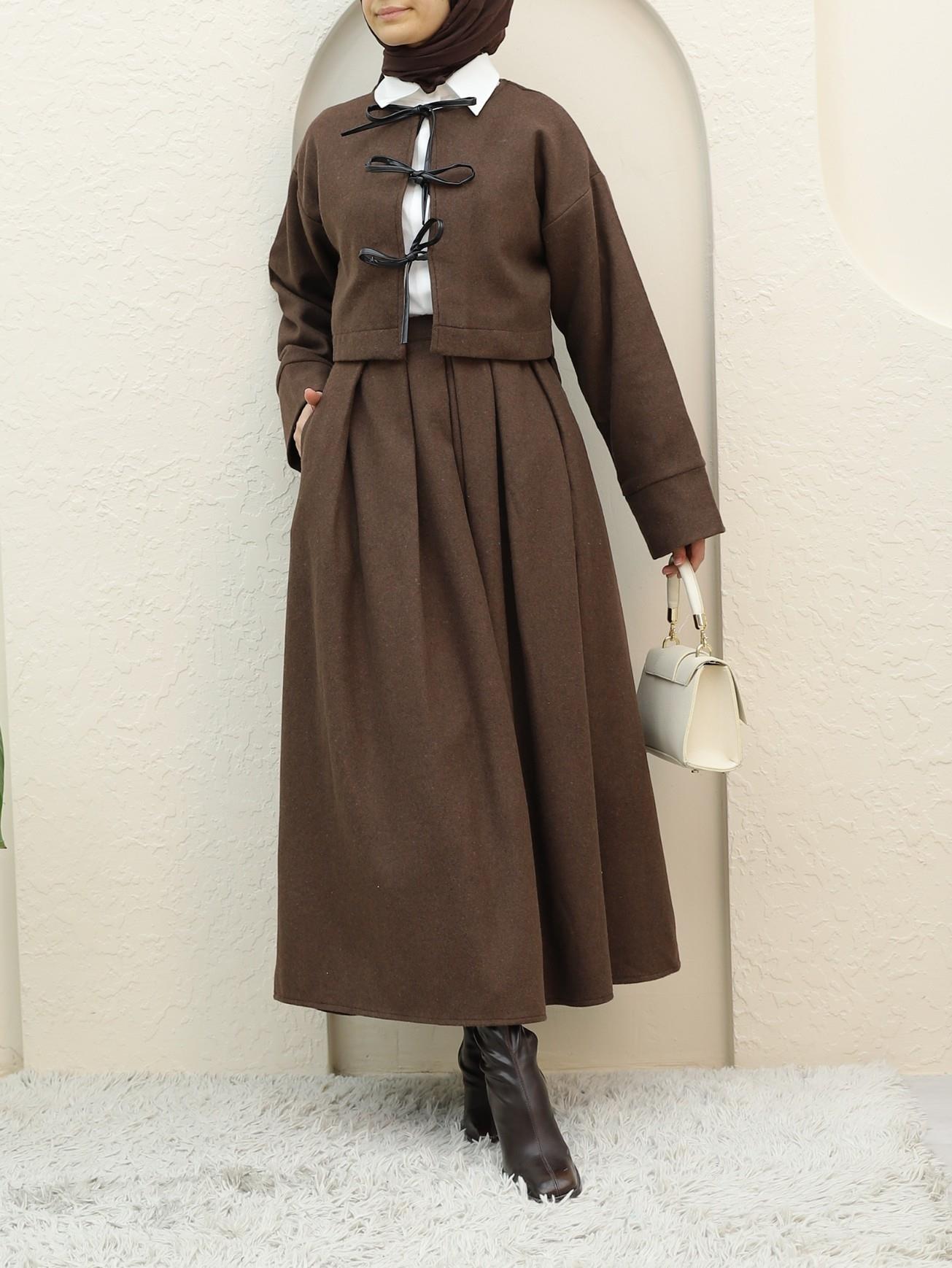 Pileli Etekli Önü Bağlamalı Kaşe Takım -Kahve (346-3042-R15)