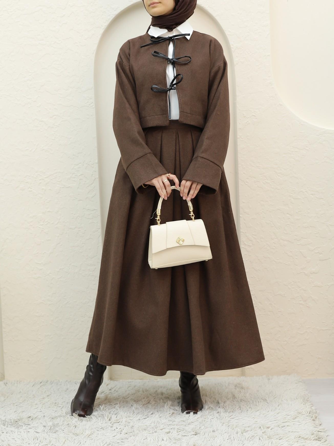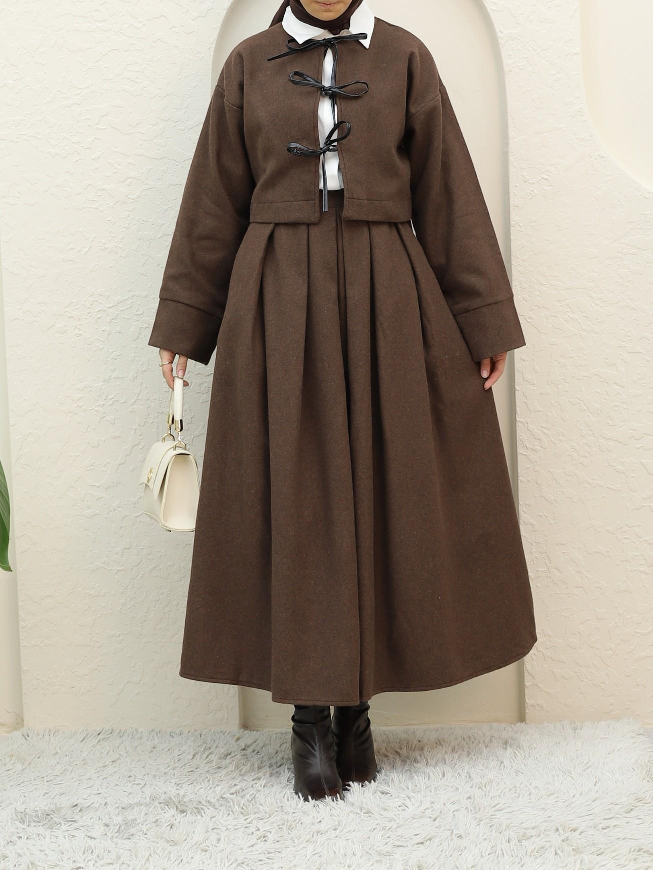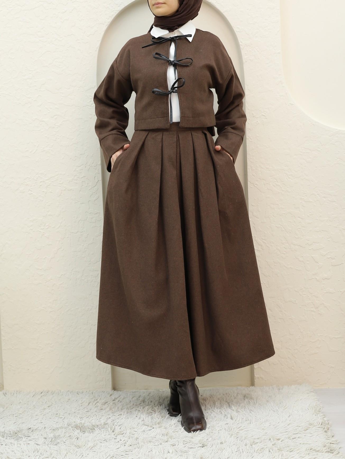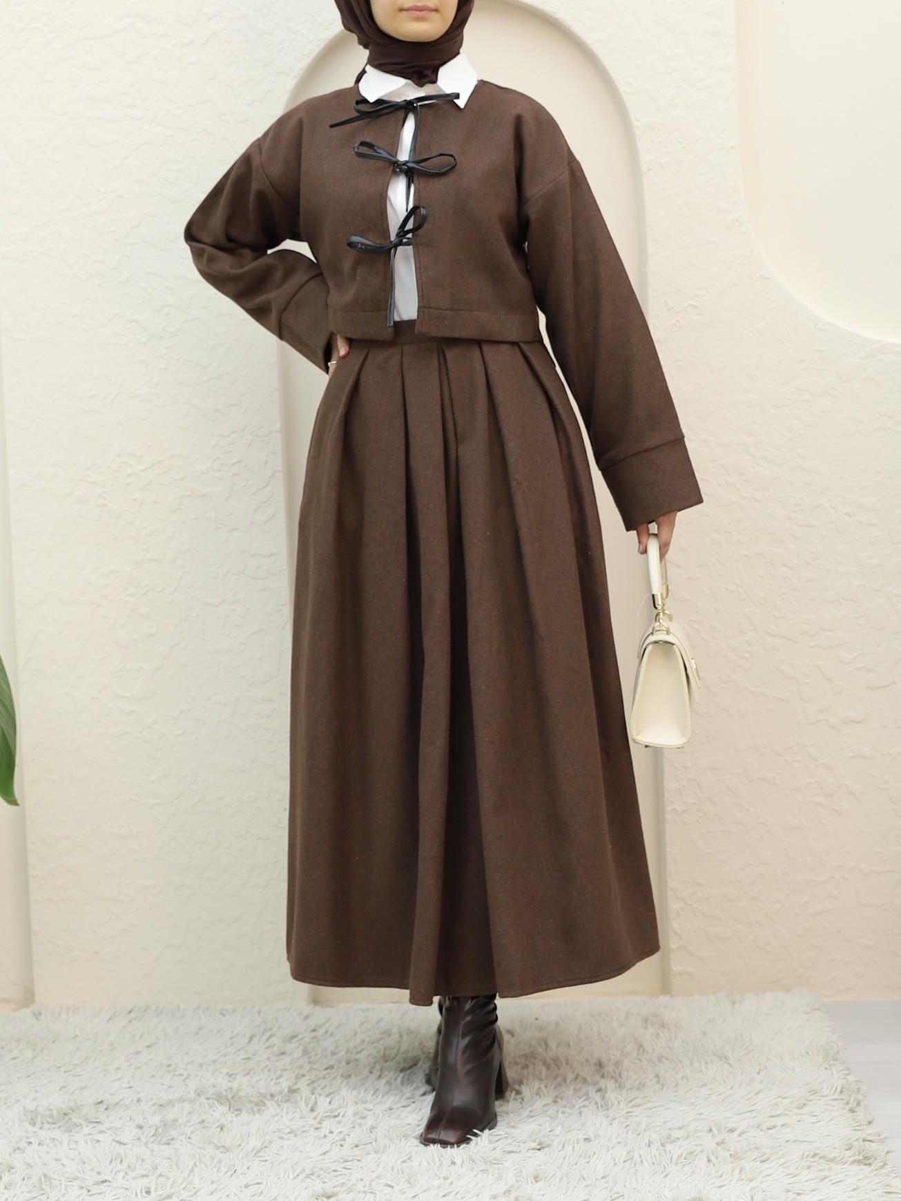Pileli Etekli Önü Bağlamalı Kaşe Takım -Kahve (346-3042-R15)