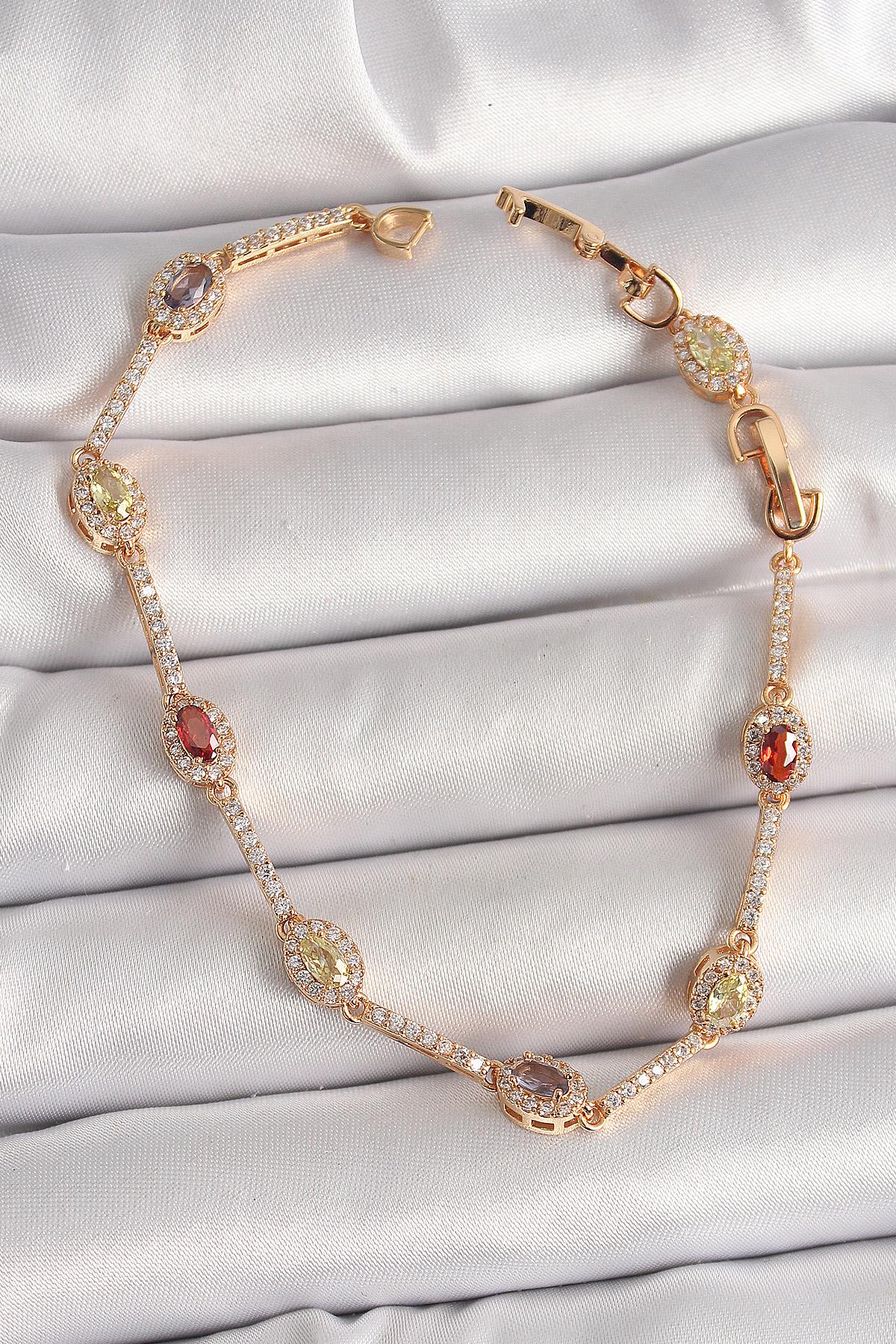 Pirinç Gold Renk Renkli Damla Zirkon Taşlı Kadın Bileklik (BB6874)