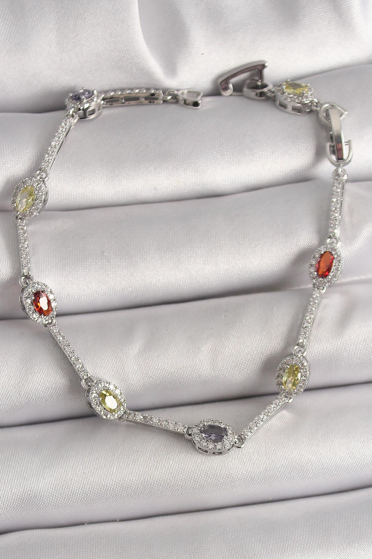 Pirinç Gümüş Renk Renkli Zirkon Taşlı Damla Taş Model Kadın Bileklik (BB6873)
