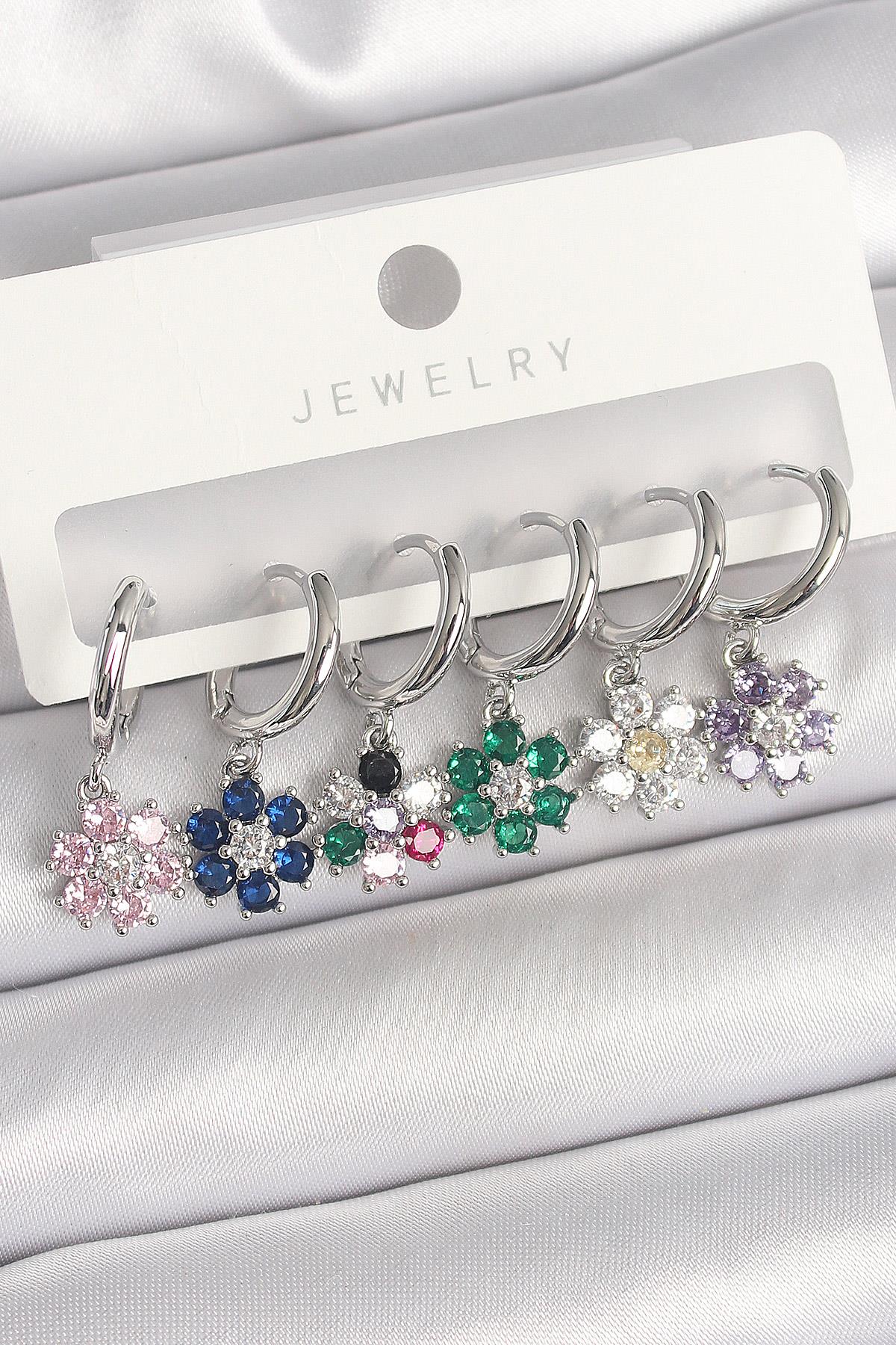 Pirinç Gümüş Renk Sallantı Renkli Zirkon Taşlı Çiçek Model Kadın Küpe Seti (BKP10370)