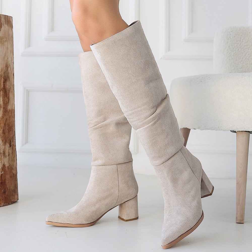Pitay Süet Topuklu Çizme -Bej modeli, kadın çizme kategorisinde, bej rengiyle kış kombinlerinize şıklık katarken rahat kalıbıyla günlük kullanımda konfor sağlar.