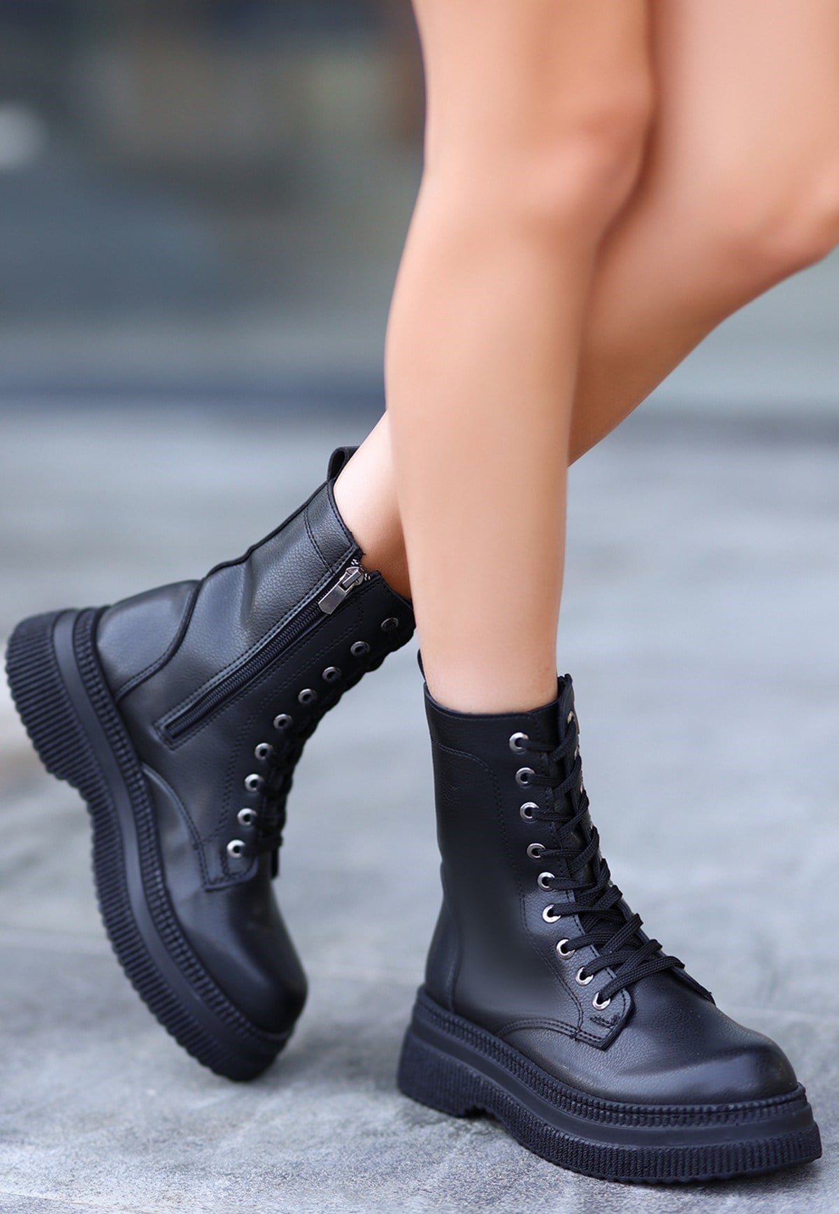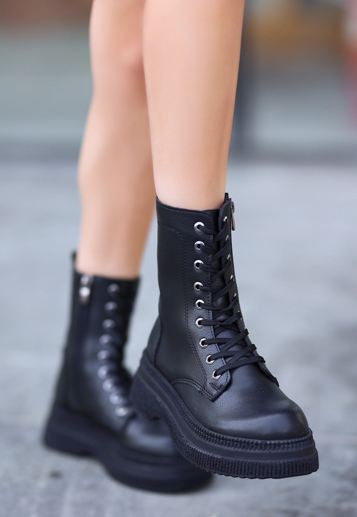 Roxan Cilt Bağcıklı Bot -Siyah modeli, kadın bot kategorisinde, siyah rengiyle soğuk havalarda hem şıklık hem de fonksiyonellik arayanlar için uygun bir seçenektir.
