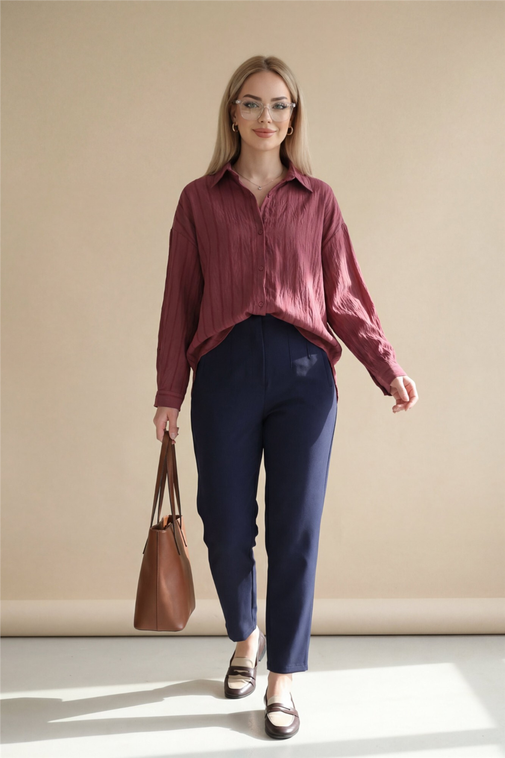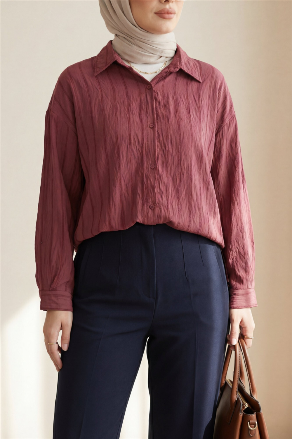 Şerit Çizgi Desenli Düğmeli Gömlek -Bordo (357-2207-R04)