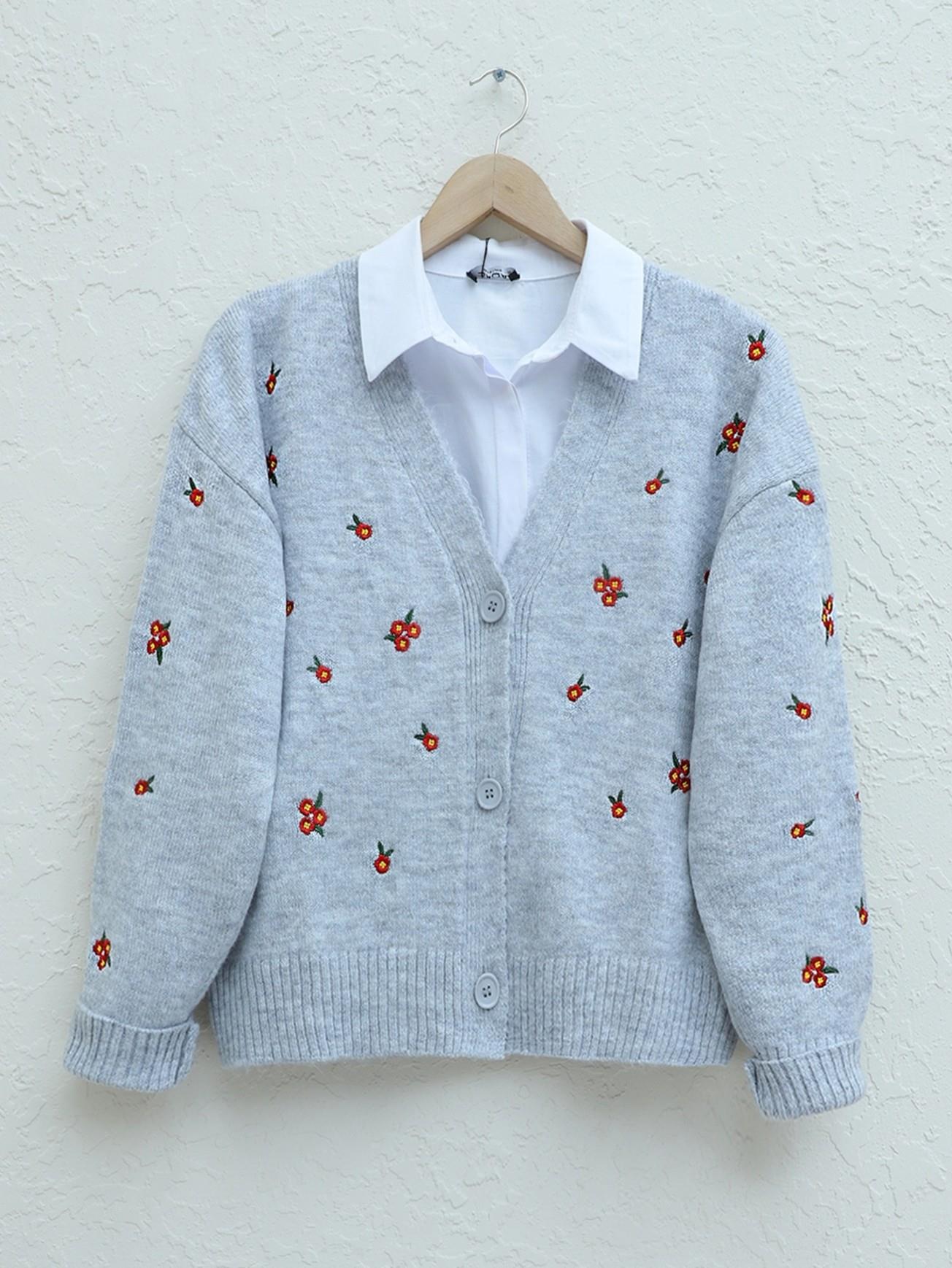 Serpme Çiçek Nakışlı Triko Hırka -Gri (109-0674-R11)