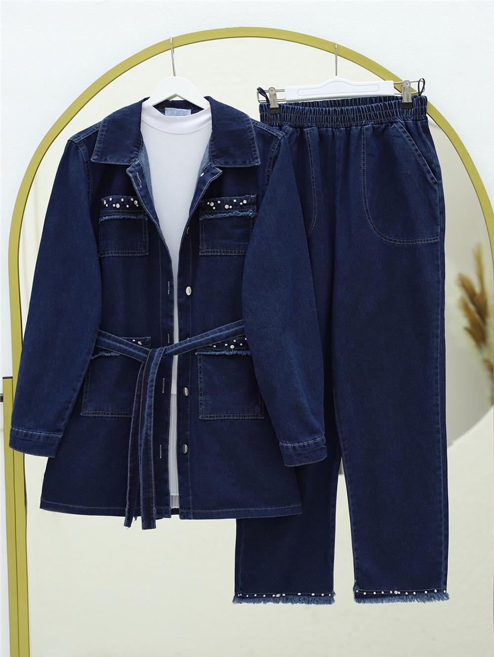 ✨ Şıklığın ve rahatlığın mükemmel uyumu! Taş detaylarıyla hareketlendirilmiş bu kot takım, zamansız tasarımı ve modern kesimiyle sofistike bir görünüm sunuyor.