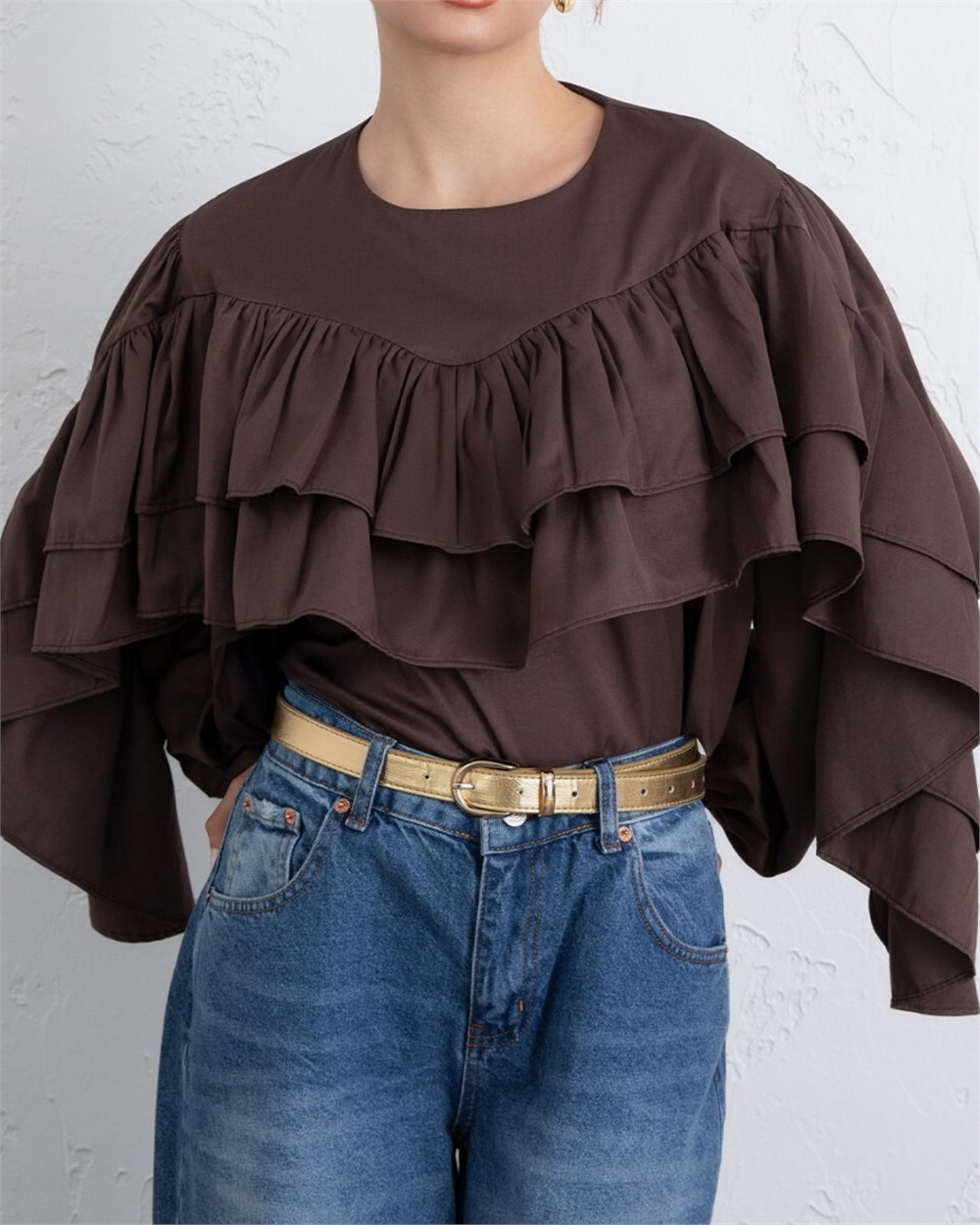 Volanlı Kolu Lastikli Bluz -K. Kahve (307-0087-R54)