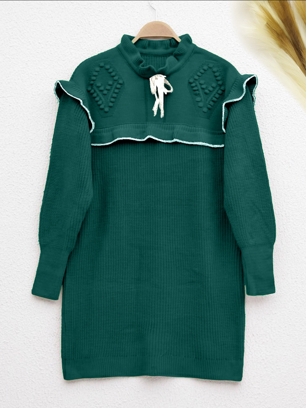 Yakası Bağcıklı Önü Fırfırlı Triko Kazak -Zümrüt (280-3005-R17)