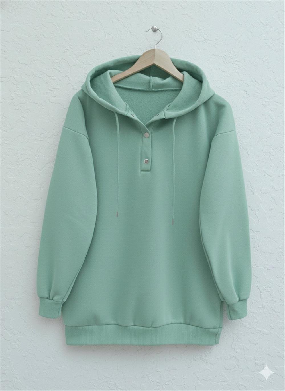 Yakası Çıtçıtlı Kapşonlu Şardonlu Üç İplik Sweat -Su Yeşili (349-5162-R36)