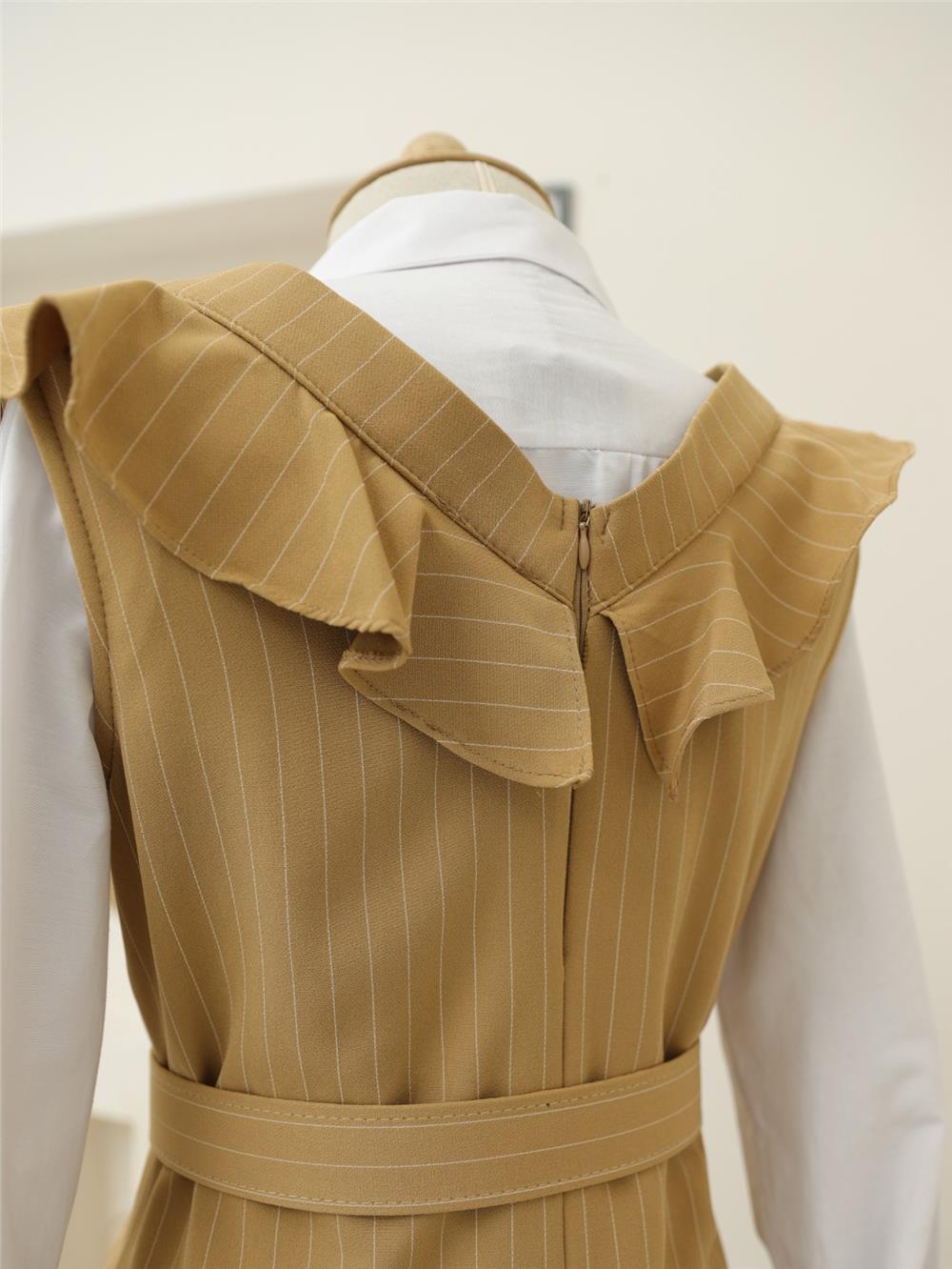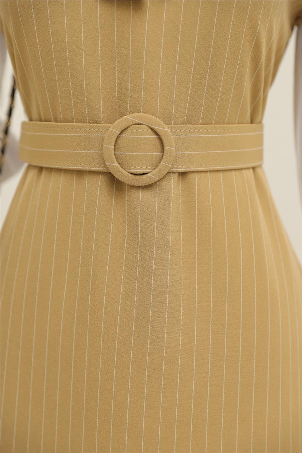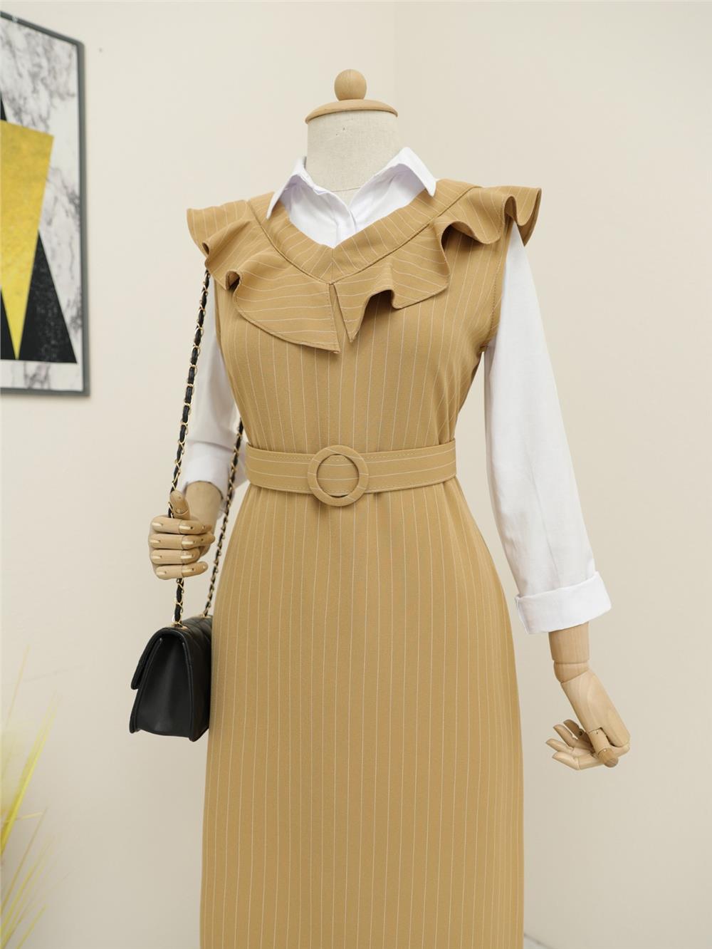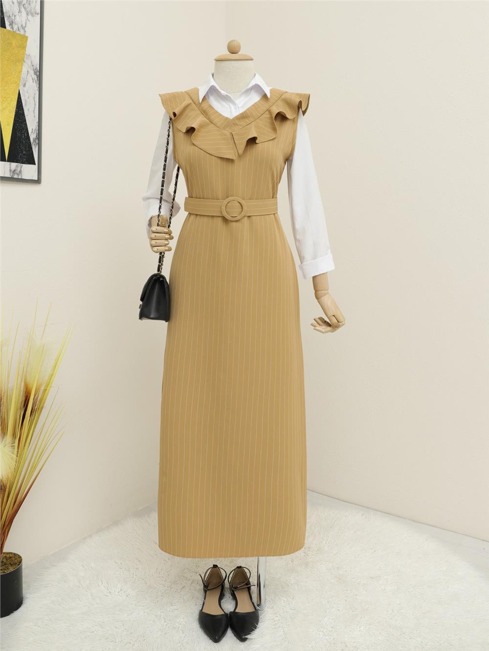 V yaka, önü fırfırlı, çizgili, kemerli jile elbise modelimiz yeni sezonun en çok sevilen modelleri arasında yer almaktadır.