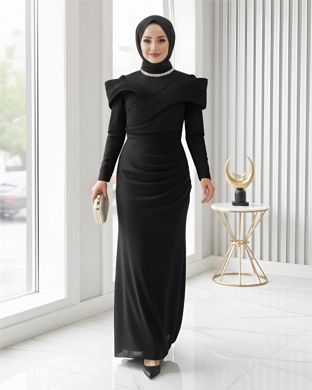 Yakası Taş Detaylı Omuzu Kat Drapeli Abiye -Siyah (316-4783-R01)