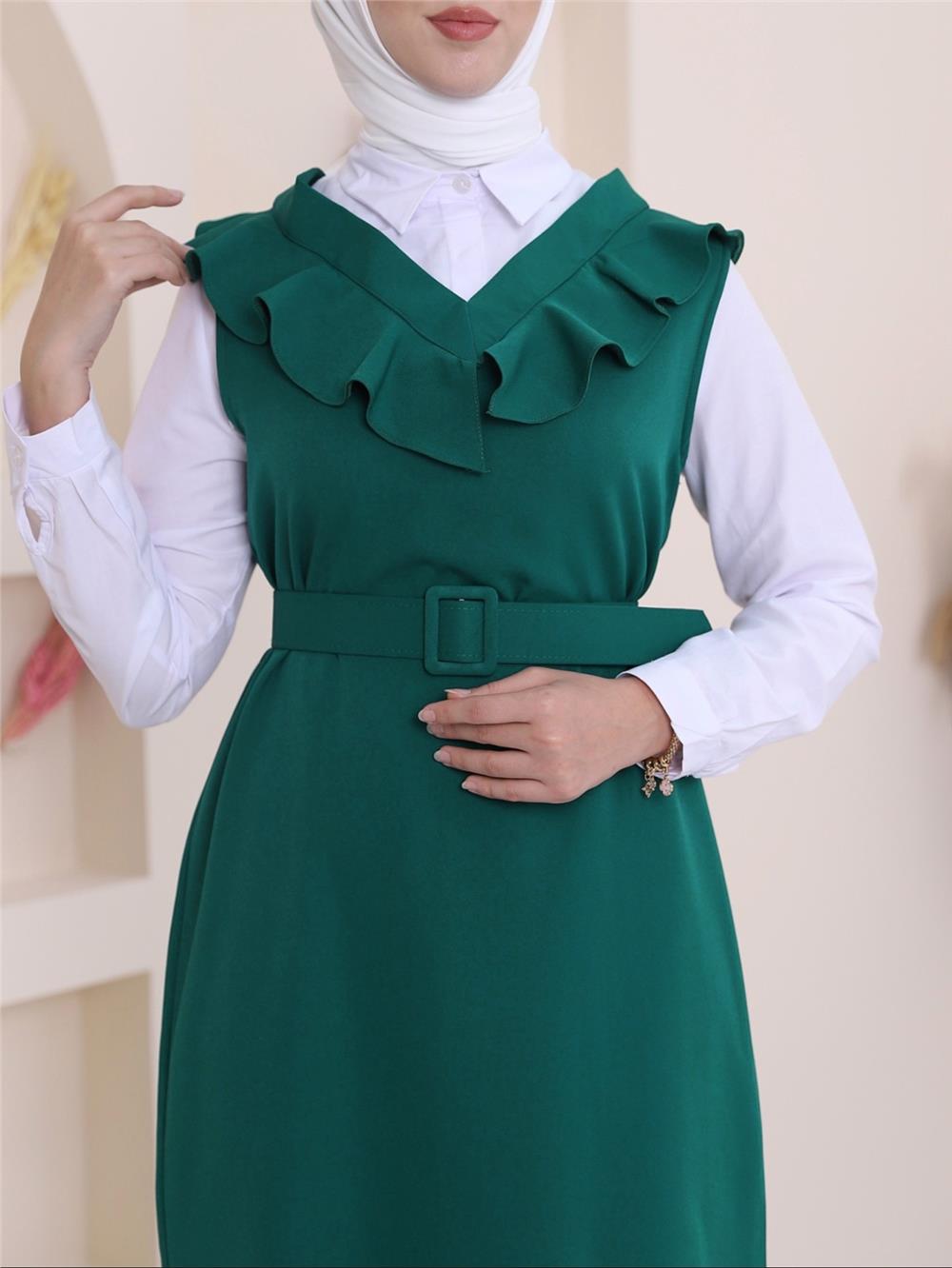 Yakası V Kemerli Uzun Jile Elbise -Zümrüt (111-60811-R17)