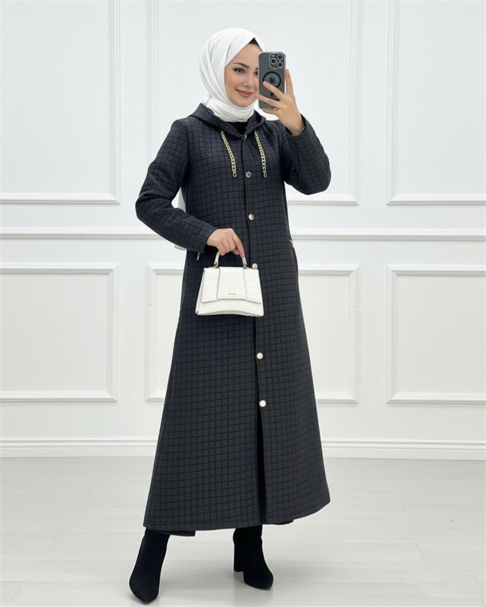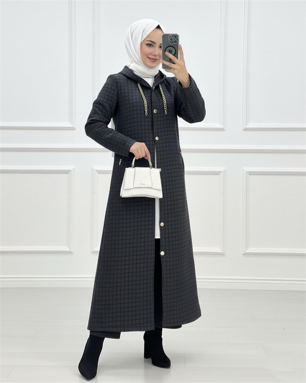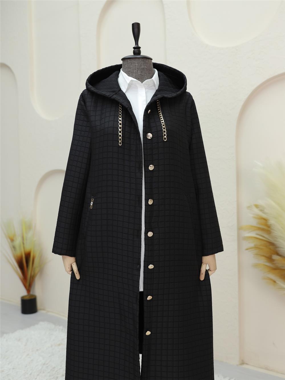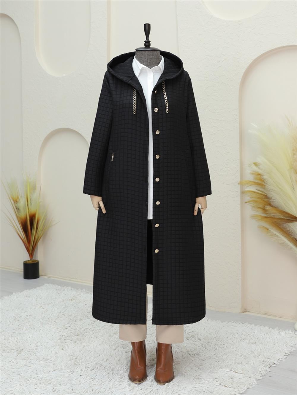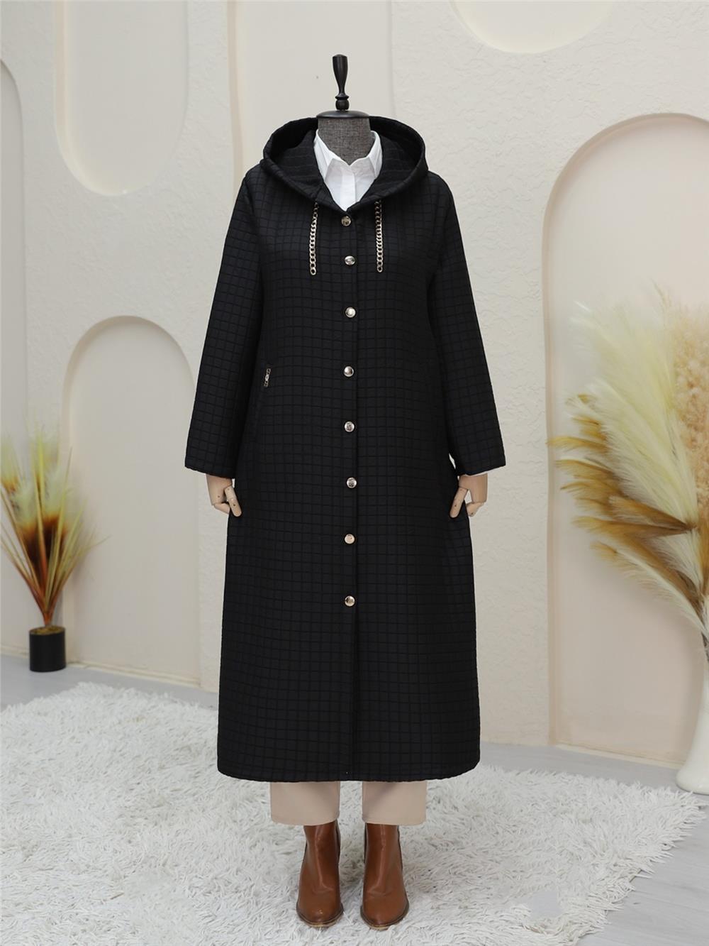 Yakası Zincir Detaylı Uzun Kapitone Kaban -Siyah (197-1314-R01)