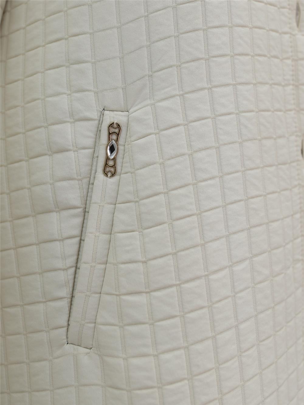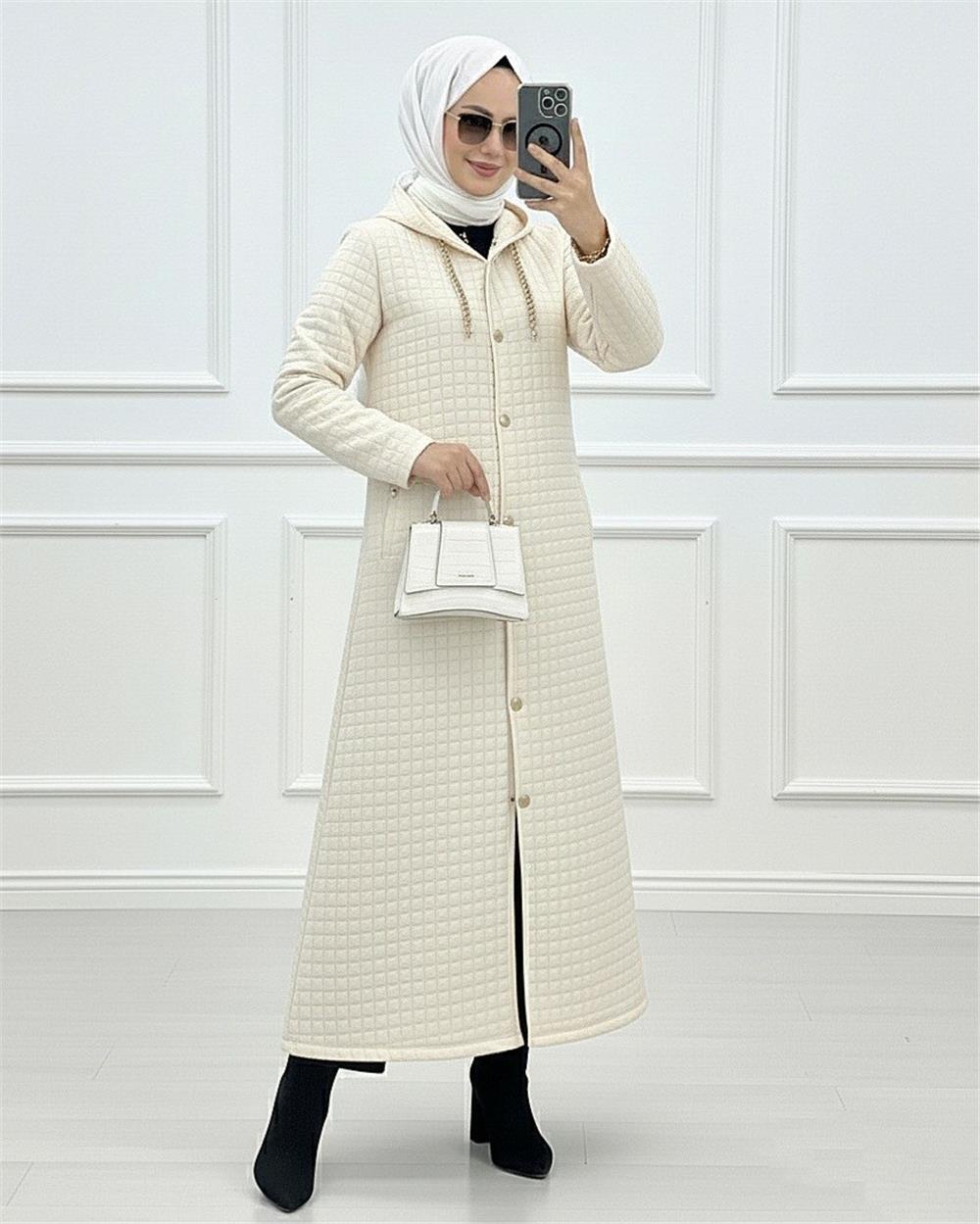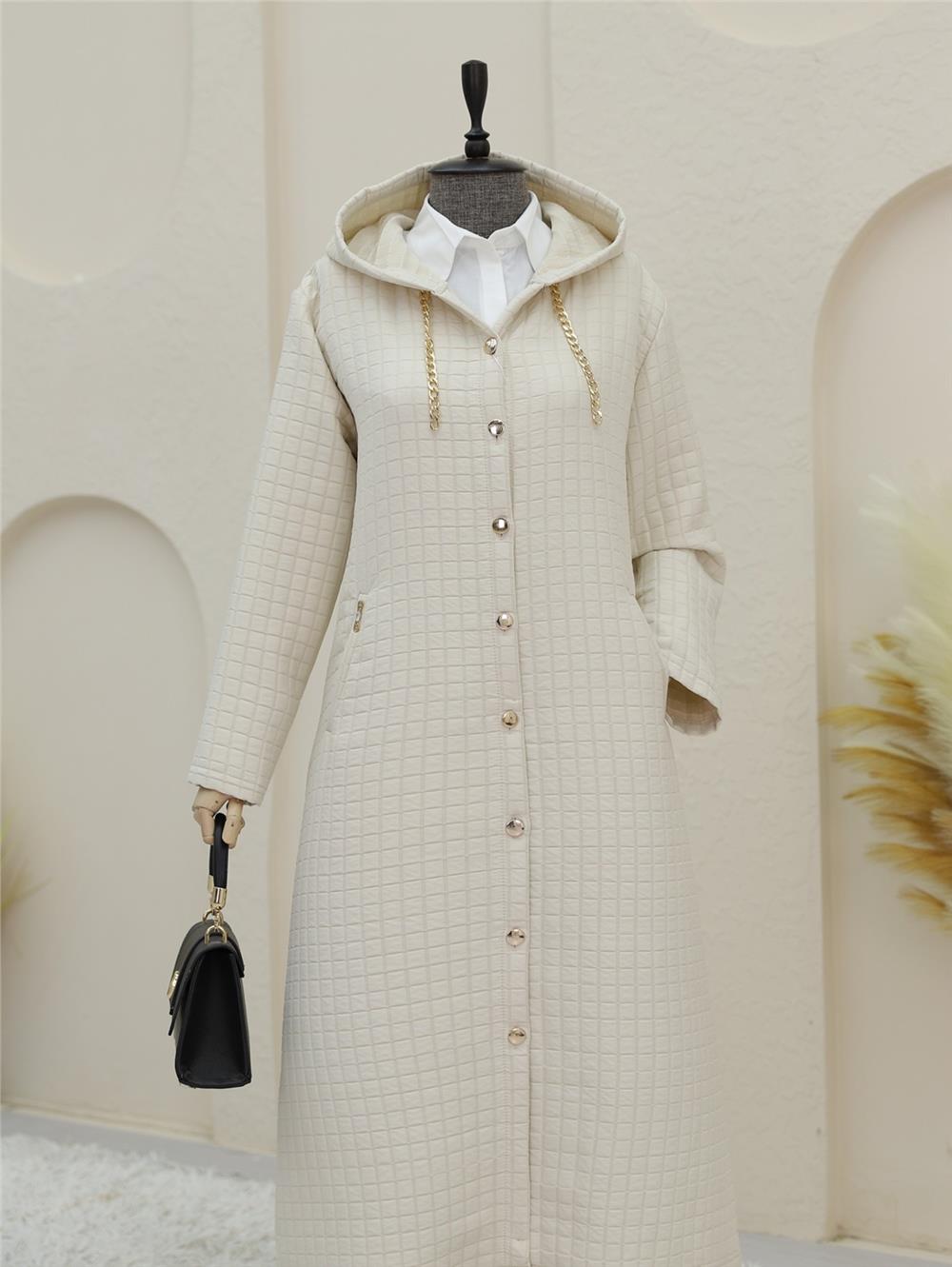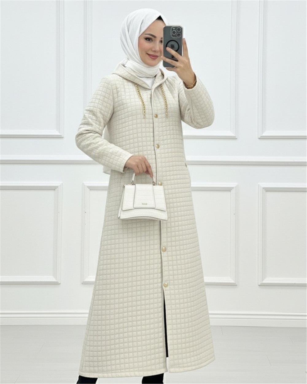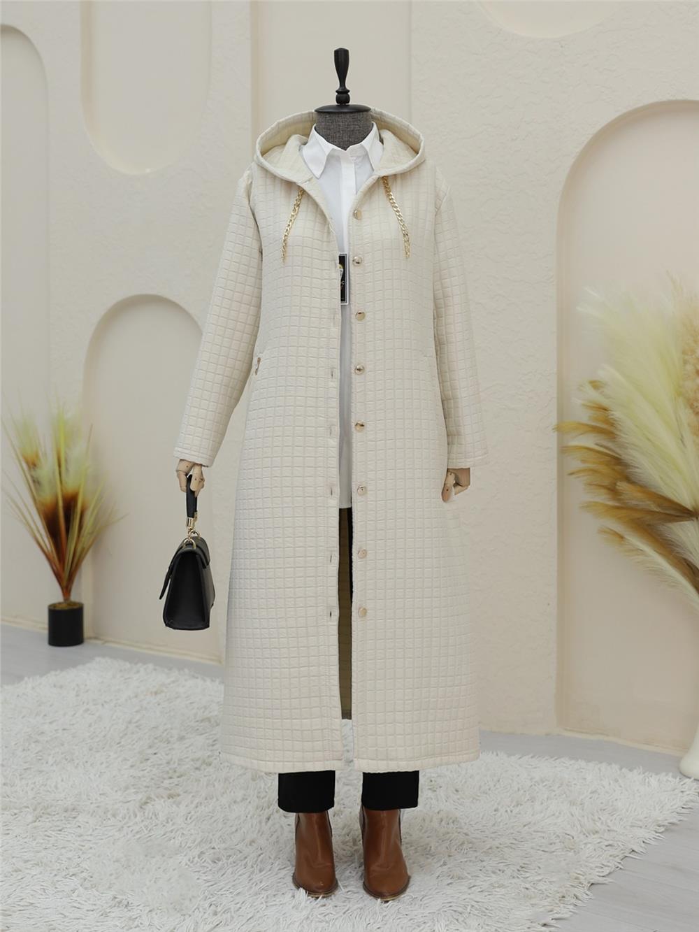 Yakası Zincir Detaylı Uzun Kapitone Kaban -Taş (197-1314-R43)