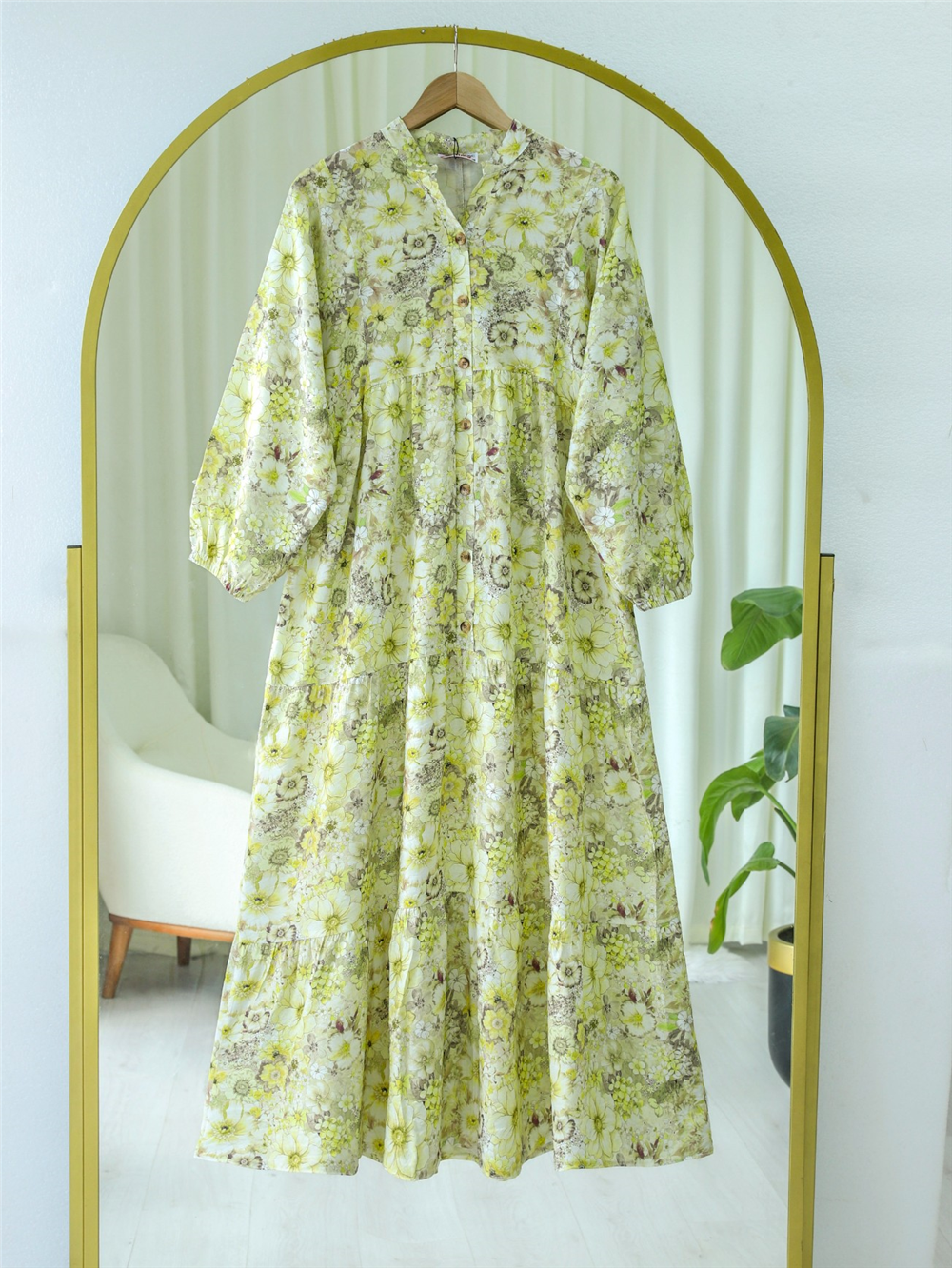 Yarım Düğmeli Kolu Lastikli Çiçek Baskılı Elbise -Sarı (197-67861-R22)
