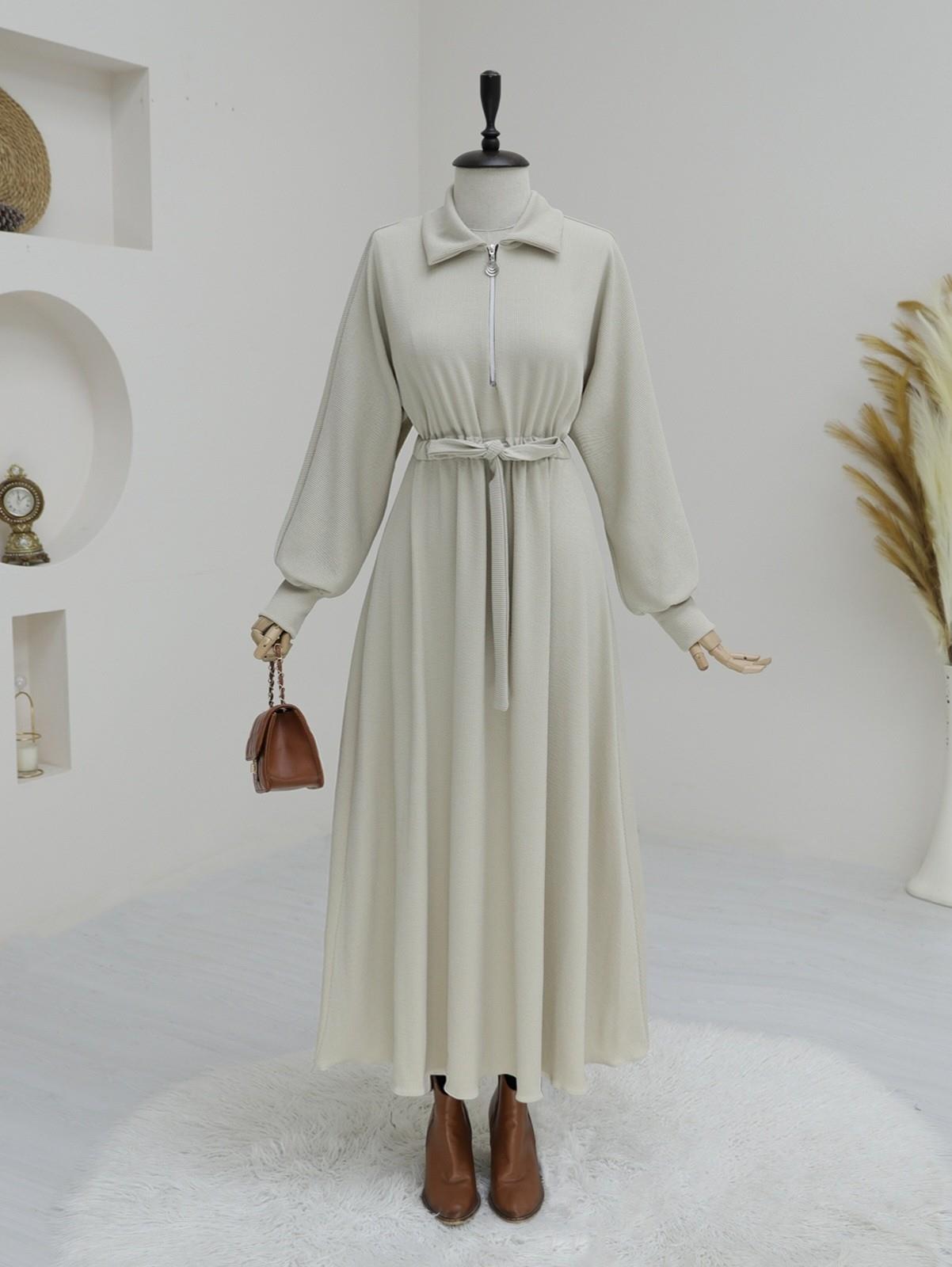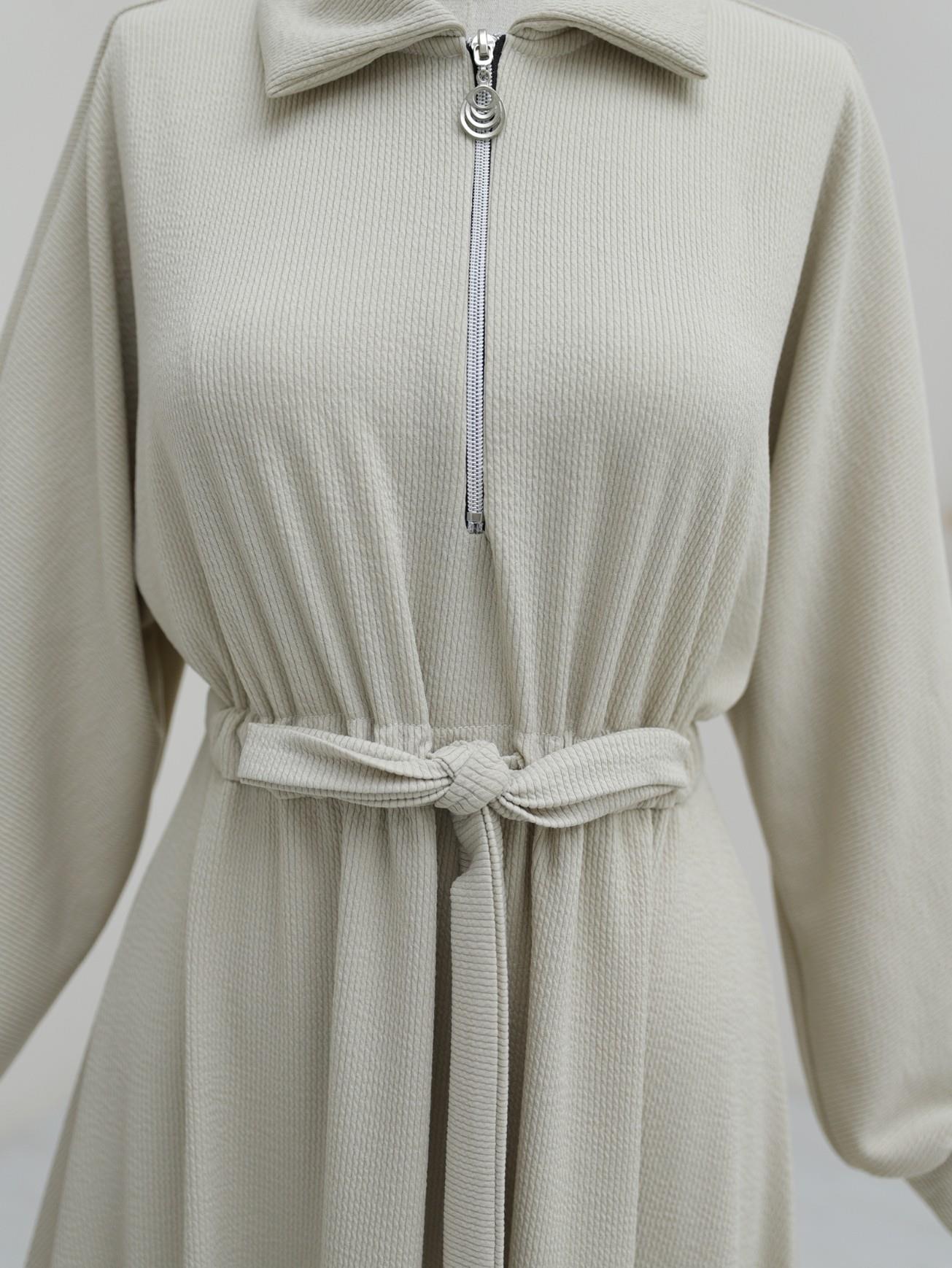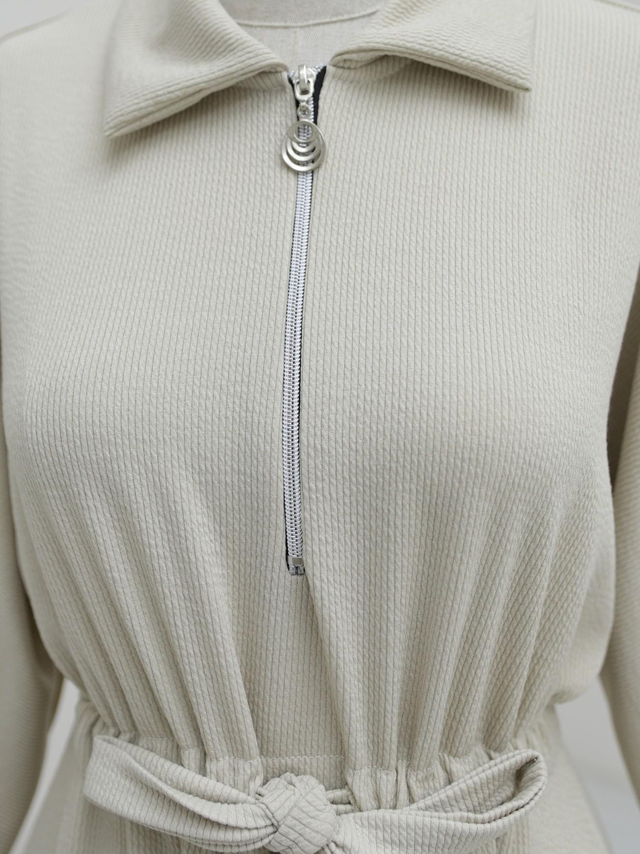 Yarım Fermuarlı Polo Yaka Beli Bağcıklı Elbise -Bej (347-8006-R56)