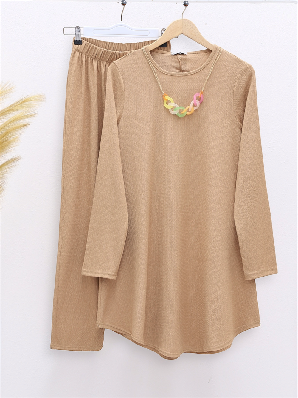 Tuniği bisiklet yaka, kolyeli, salaş; pantolonunun beli lastikli, bol paça cepsiz takım modelimiz yeni sezonun en çok sevilen modelleri arasında yer almaktadır.