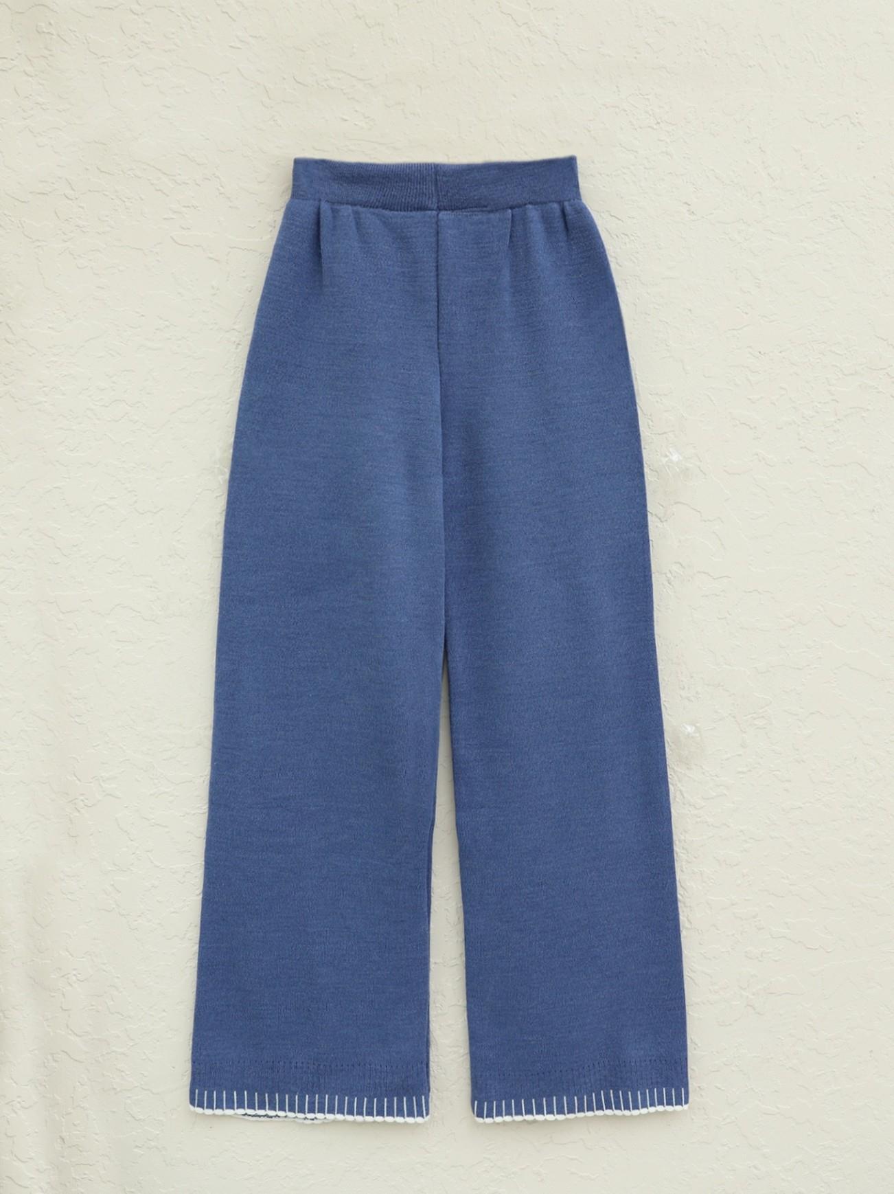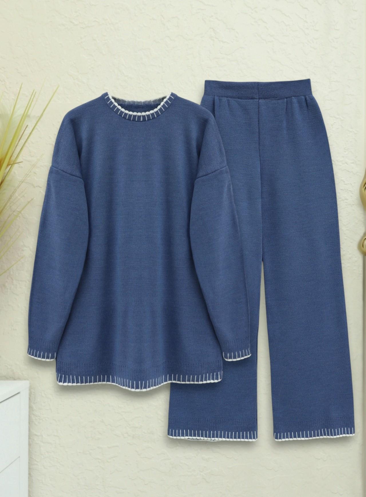 Yuvarlak Yaka Uçları Nakış Detaylı Triko Takım -İndigo (384-402-R21)